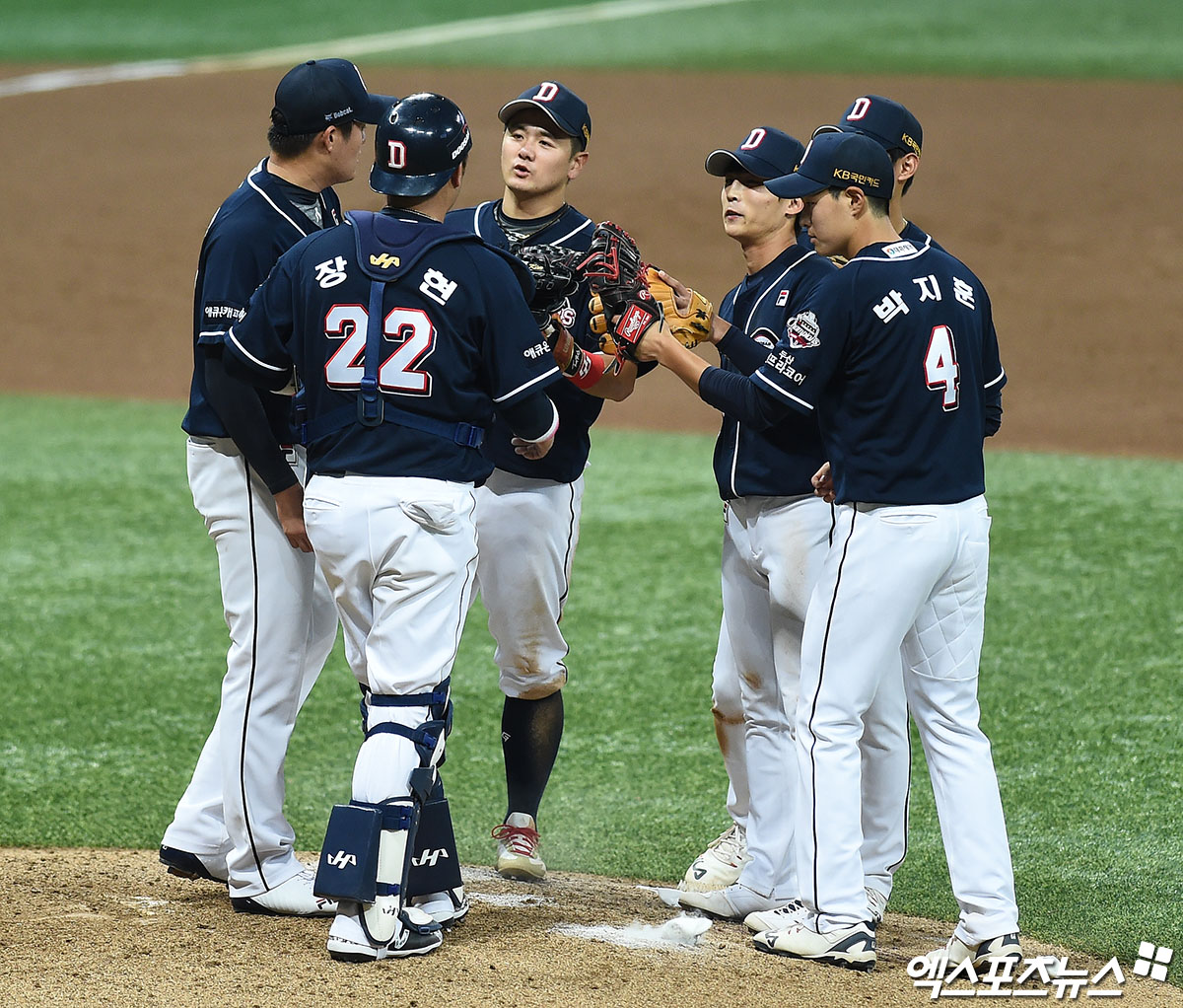 경기 종료 후 두산 선수들이 마운드에 모여 승리의 기쁨을 나누고 있다.
