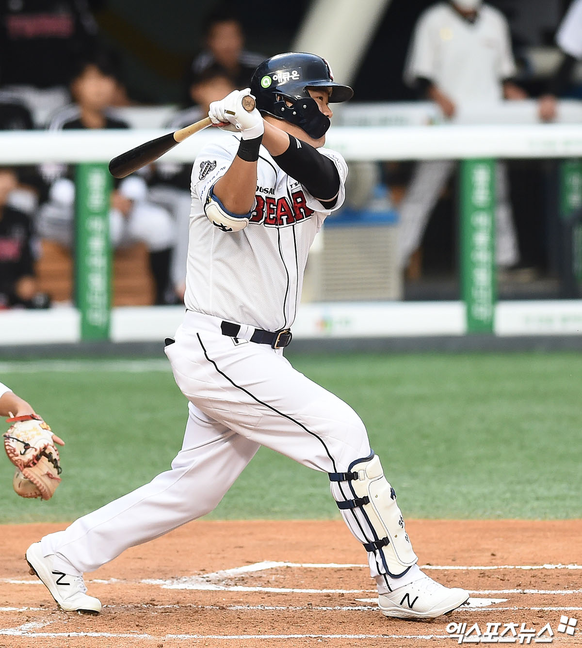 [엑스포츠뉴스 잠실, 박지영 기자] 7일 오후 서울 송파구 잠실야구장에서 열린 '2020 신한은행 SOL KBO리그' LG 트윈스와 두산 베어스의 경기, 1회말 1사 2,3루 두산 오재일이 1타점 땅볼을 때려내고 있다.
