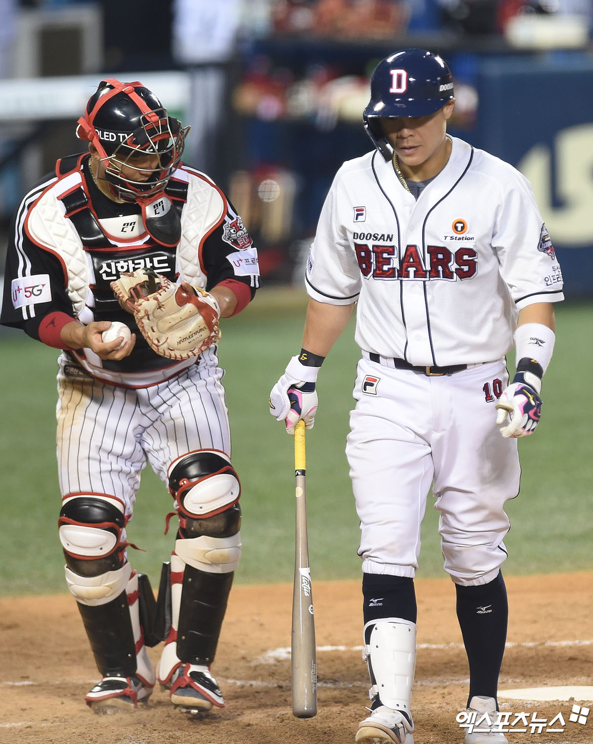 [엑스포츠뉴스 잠실, 김한준 기자] 8일 오후 서울 송파구 잠실야구장에서 열린 ‘2020 신한은행 SOL KBO리그’ LG 트윈스와 두산 베어스의 경기, 5회말 두산 박세혁이 헛스윙 삼진을 당하고 있다.