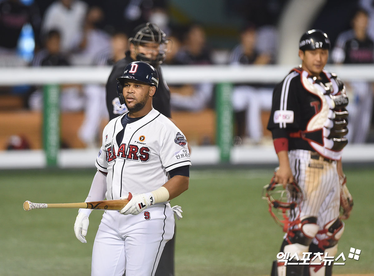 [엑스포츠뉴스 잠실, 김한준 기자] 8일 오후 서울 송파구 잠실야구장에서 열린 ‘2020 신한은행 SOL KBO리그’ LG 트윈스와 두산 베어스의 경기, 6회말 두산 페르난데스가 루킹 삼진을 당한 후 아쉬워하고 있다.