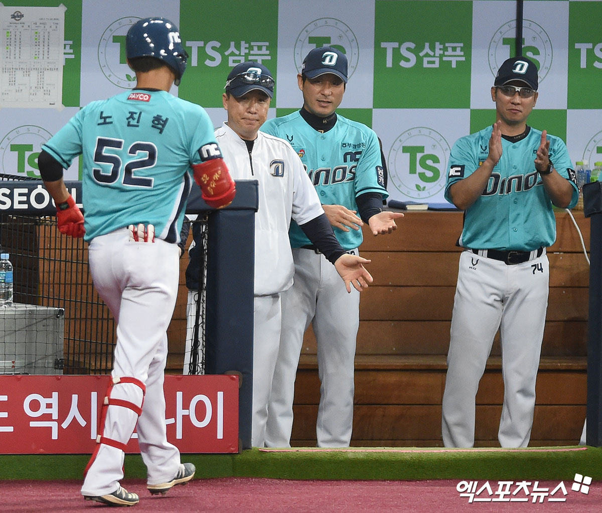 [엑스포츠뉴스 고척, 김한준 기자] 14일 오후 서울 구로구 고척스카이돔에서 열린 ‘2020 신한은행 SOL KBO리그’ NC 다이노스와 키움 히어로즈의 경기, 2회초 1사 NC 노진혁이 솔로 홈런을 날린 후 더그아웃에서 축하를 받고 있다.