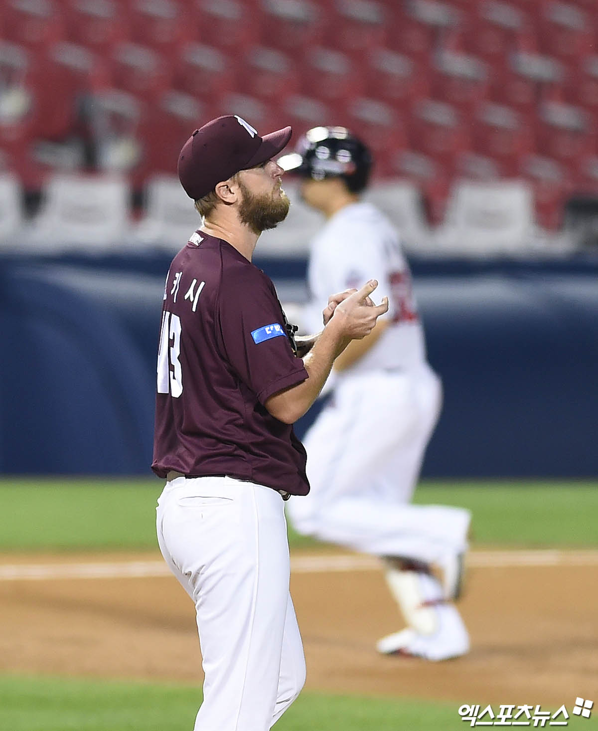 [엑스포츠뉴스 잠실, 박지영 기자] 21일 오후 서울 송파구 잠실야구장에서 열린 '2020 신한은행 SOL KBO리그' 키움 히어로즈와 두산 베어스의 경기, 6회말 2사 2루 키움 선발투수 요키시가 두산 김재환에게 투런 홈런을 허용한 뒤 아쉬워하고 있다.