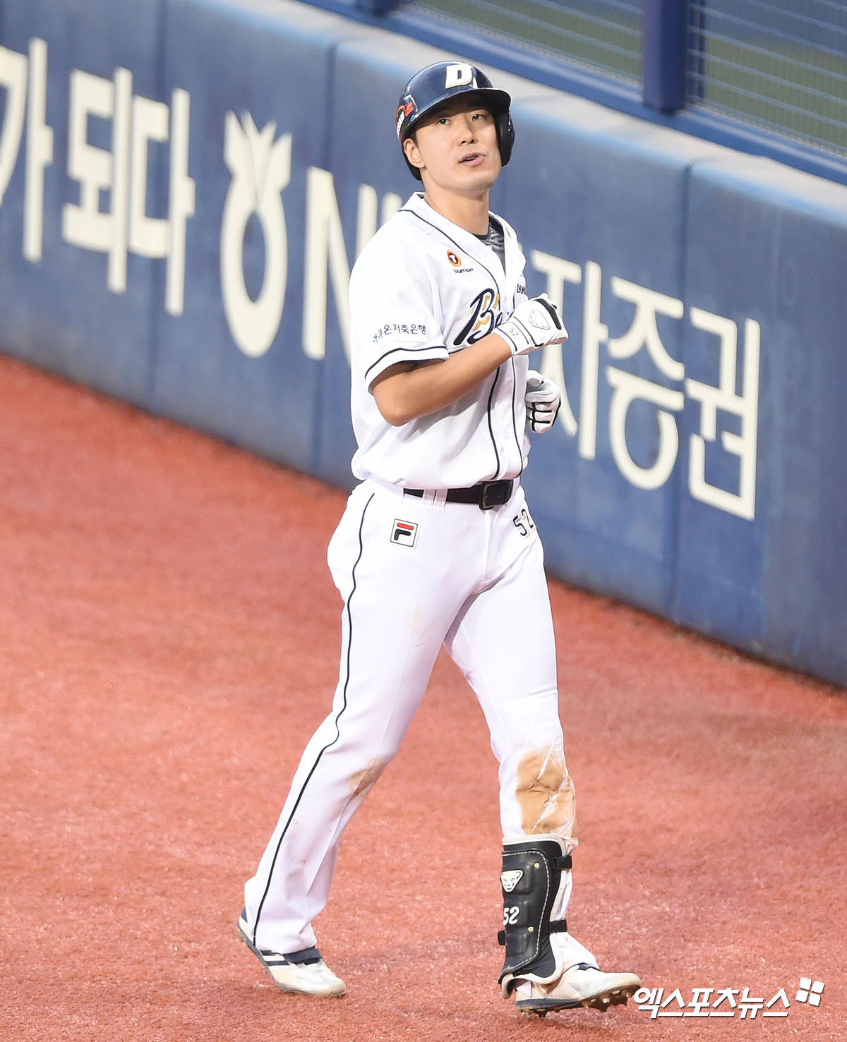 [엑스포츠뉴스 잠실, 김한준 기자] 25일 오후 서울 송파구 잠실야구장에서 열린 ‘2020 신한은행 SOL KBO리그’ LG 트윈스와 두산 베어스의 경기, 6회말 1사 2,3루 두산 김재호가 2루수 플라이 아웃된 후 아쉬워하고 있다.