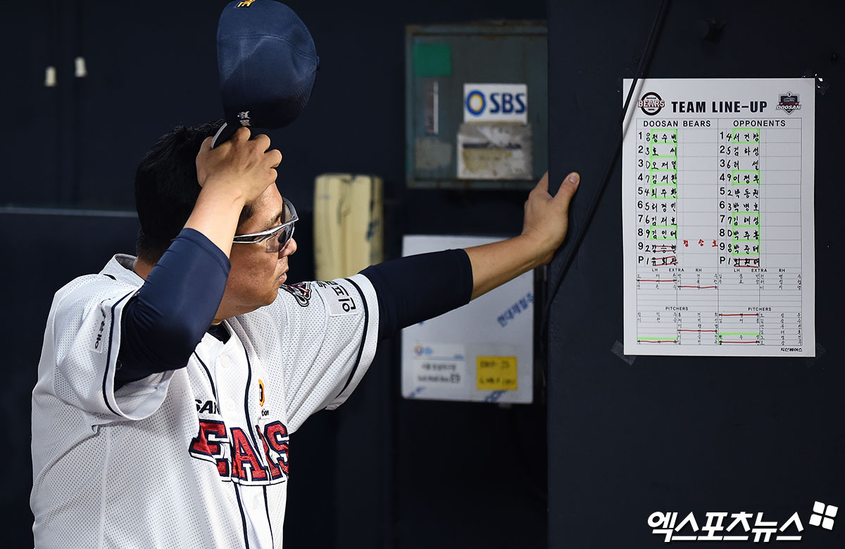 [엑스포츠뉴스 잠실, 박지영 기자] 30일 오후 서울 송파구 잠실야구장에서 열린 '2020 신한은행 SOL KBO리그' 키움 히어로즈와 두산 베어스의 경기, 7회말 두산 김태형 감독이 더그아웃에서 라인업을 살피고 있다.