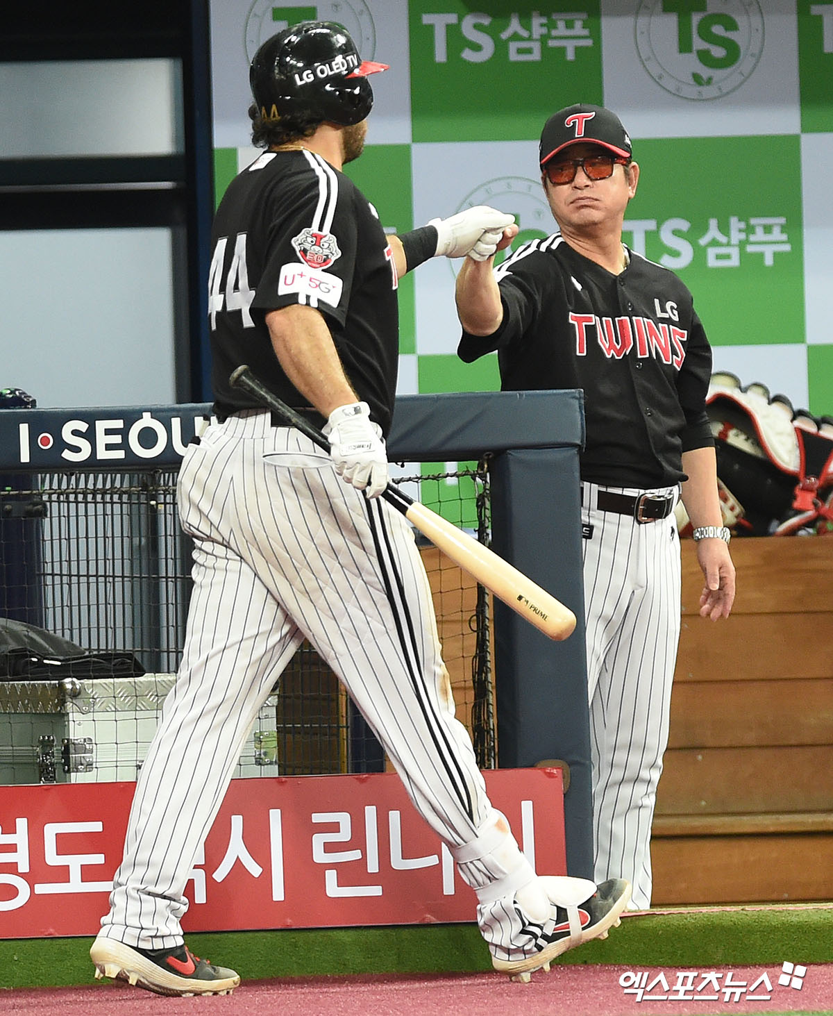 9회초 1사 1루 LG 라모스가 솔로 홈런을 날린 후 류중일 감독과 함께 기뻐하고 있다.