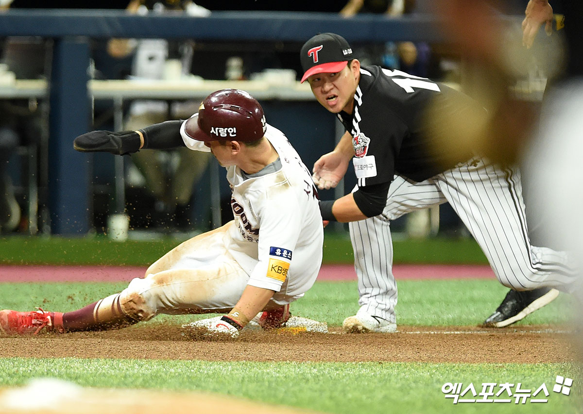[엑스포츠뉴스 고척, 김한준 기자] 9일 오후 서울 구로구 고척스카이돔에서 열린 ‘2020 신한은행 SOL KBO리그’ LG 트윈스와 키움 히어로즈의 경기, 5회말 무사 1루 키움 서건창이 김하성의 좌전안타때 3루까지 진루하고 있다.