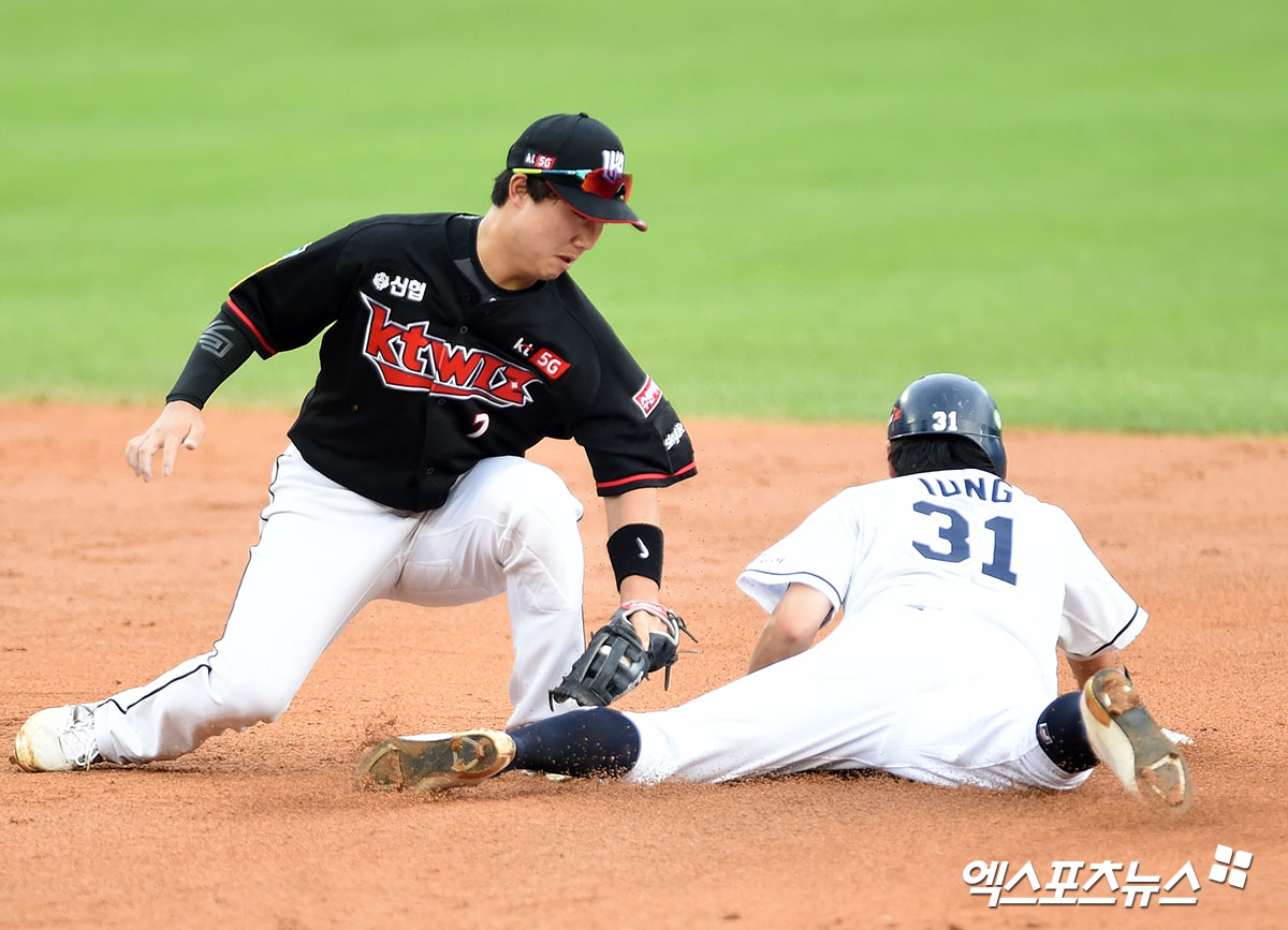 [엑스포츠뉴스 잠실, 김한준 기자] 16일 오후 서울 송파구 잠실야구장에서 열린 ‘2020 신한은행 SOL KBO 리그’ KT 위즈와 두산 베어스의 경기, 3회말 2사 1루 두산 정수빈이 2루 도루에 성공하고 있다.