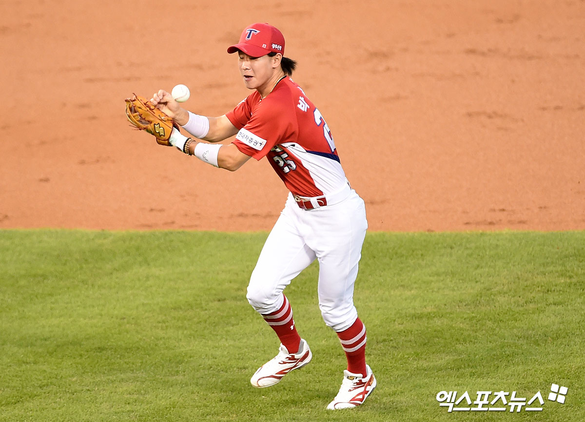 [엑스포츠뉴스 잠실, 김한준 기자] 19일 오후 서울 송파구 잠실야구장에서 열린 ‘2020 신한은행 SOL KBO 리그’ KIA 타이거즈와 LG 트윈스의 경기, 2회말 2사 1루 KIA 박찬호가 LG 유강남의 타구를 놓치고 있다.