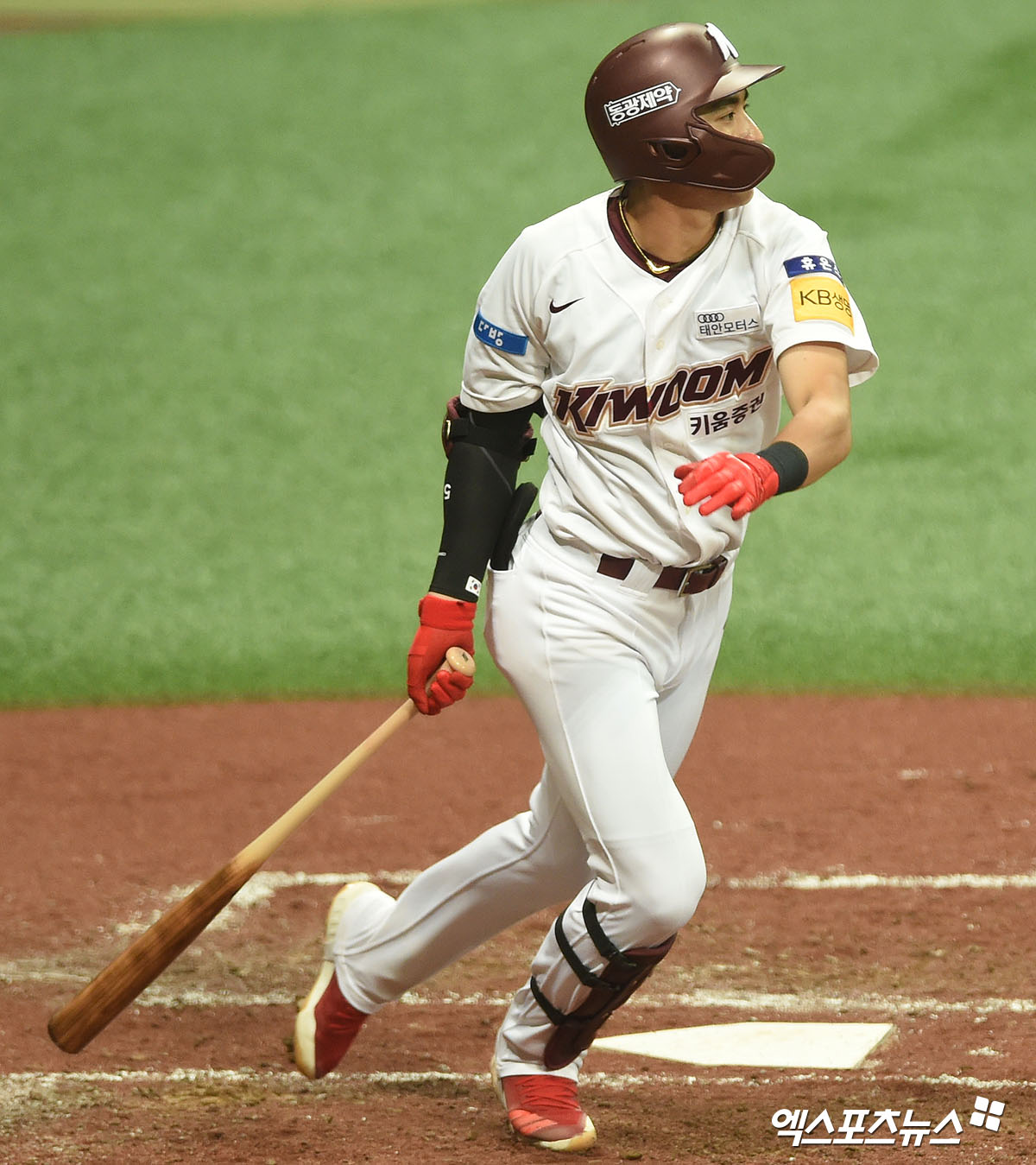 [엑스포츠뉴스 고척, 김한준 기자] 20일 오후 서울 구로구 고척스카이돔에서 열린 ‘2020 신한은행 SOL KBO 리그’ LG 트윈스와 키움 히어로즈의 경기, 3회말 무사 1루 키움 이정후가 좌중간 안타를 날리고 있다.