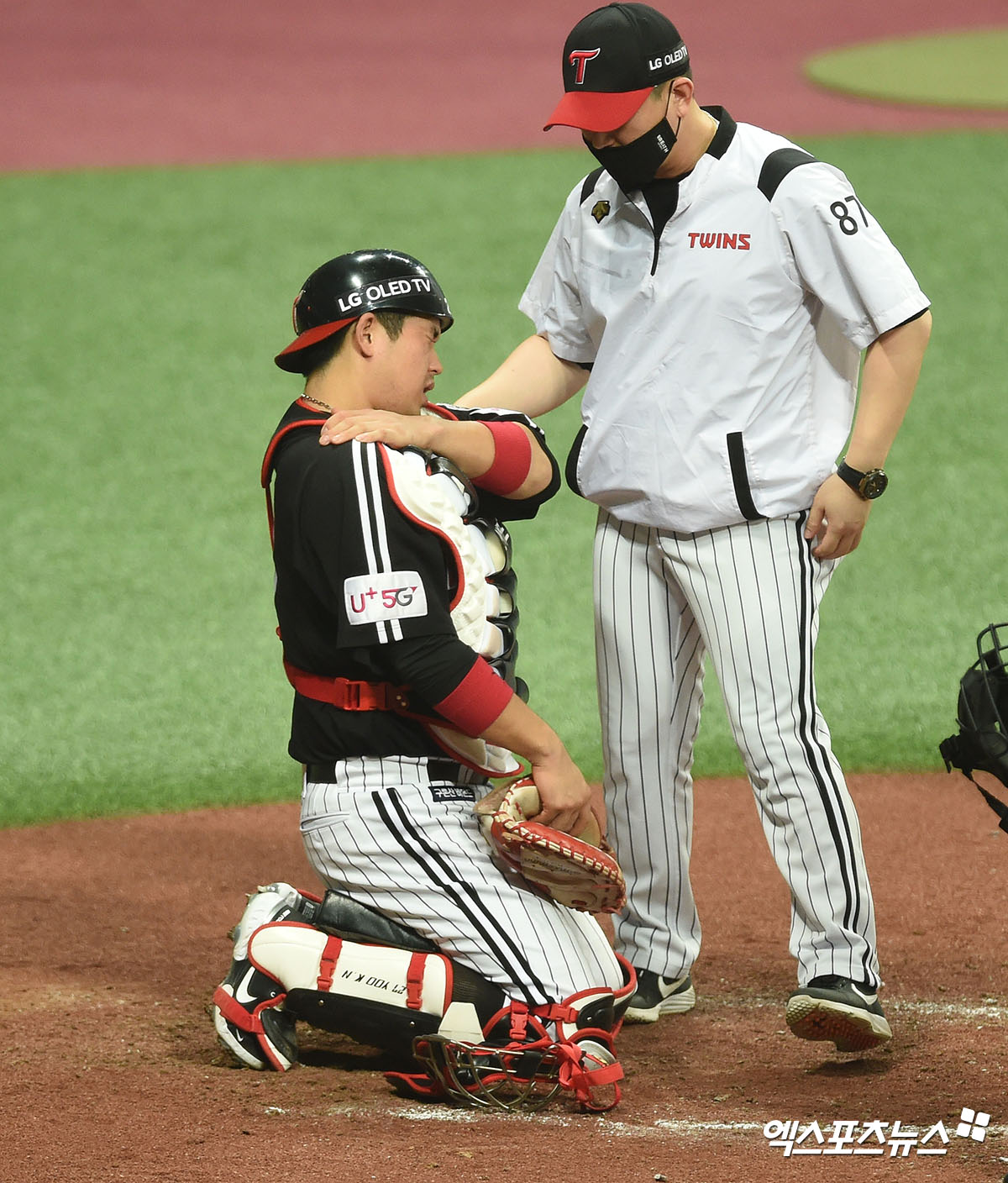 [엑스포츠뉴스 고척, 김한준 기자] 20일 오후 서울 구로구 고척스카이돔에서 열린 ‘2020 신한은행 SOL KBO 리그’ LG 트윈스와 키움 히어로즈의 경기, 3회말 2사 LG 유강남이 파울 타구에 맞은 후 고통스러워하고 있다.