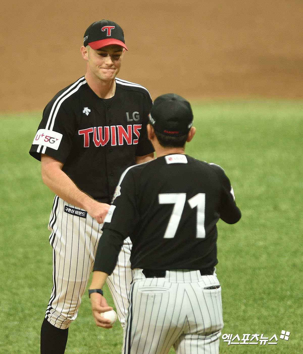 [엑스포츠뉴스 고척, 김한준 기자] 21일 오후 서울 구로구 고척스카이돔에서 열린 ‘2020 신한은행 SOL KBO 리그’ LG 트윈스와 키움 히어로즈의 경기, 8회말 2사 1,2루 LG 선발투수 윌슨이 마운드를 내려가고 있다.