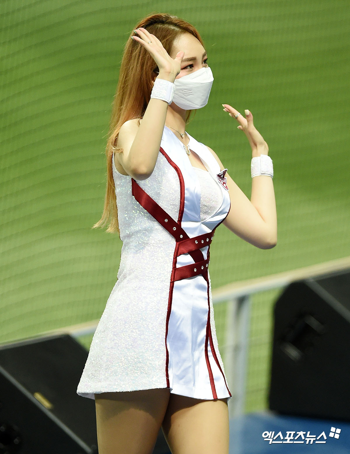 [엑스포츠뉴스 고척, 김한준 기자] 22일 오후 서울 구로구 고척스카이돔에서 열린 ‘2020 신한은행 SOL KBO 리그’ KIA 타이거즈와 키움 히어로즈의 경기, 키움 치어리더 신수인이 멋진 공연을 선보이고 있다.