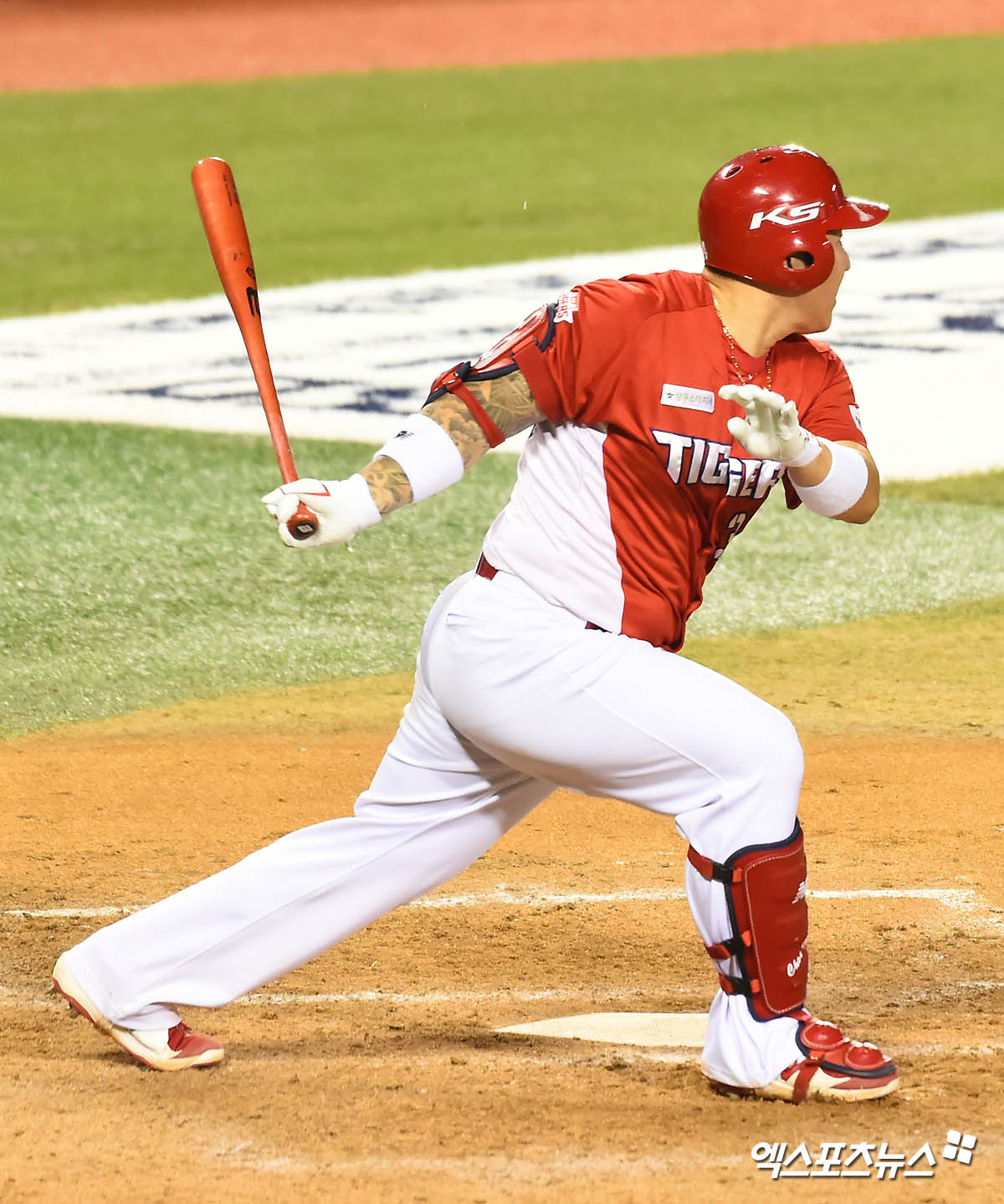 [엑스포츠뉴스 잠실, 윤다희 기자] 26일 오후 서울 송파구 잠실야구장에서 열린 ‘2020 신한은행 SOL KBO 리그’ KIA 타이거즈와 두산 베어스의 경기, 9회초 무사 KIA 최형우가 좌익수 왼쪽 안타를 날리고 있다.