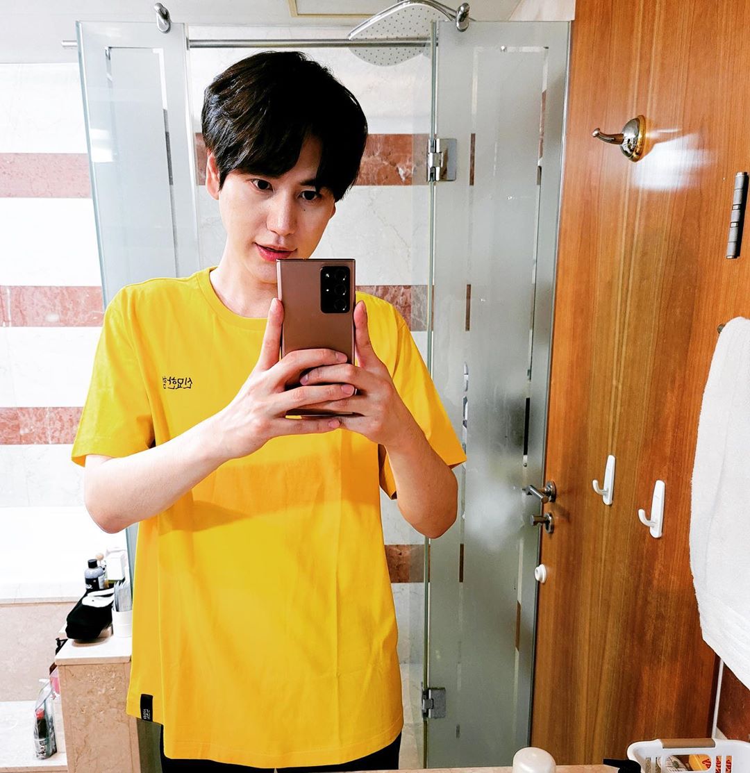 공개된 사진 속 규현은 노란색 티셔츠를 입은 채 화장실 거울을 마주하고 있는 모습이다. 셀카를 찍으며 집중하고 있는 규현의 훈훈한 비주얼이 보는 이들의 시선을 사로잡는다.