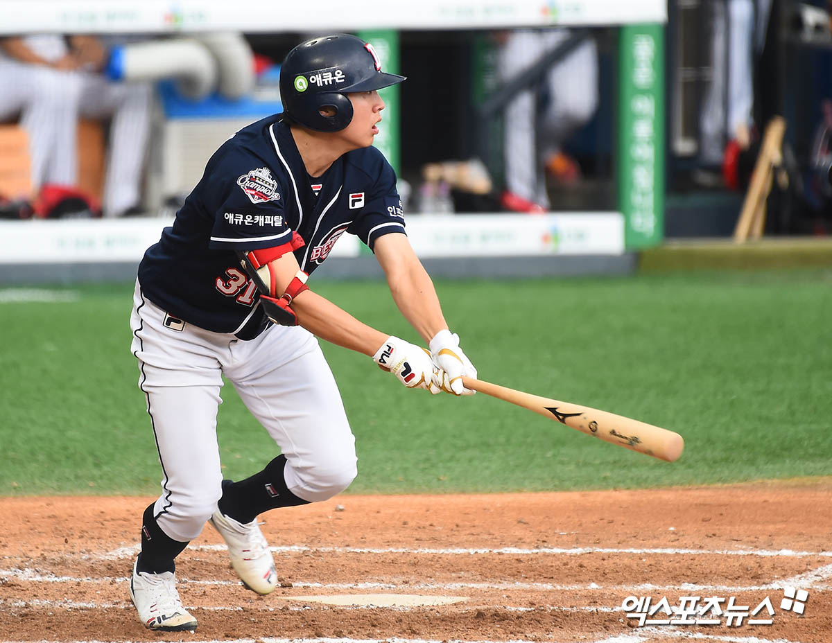 [엑스포츠뉴스 잠실, 윤다희 기자] 30일 오후 서울 송파구 잠실야구장에서 열린 ‘2020 신한은행 SOL KBO 리그’ 두산 베어스와 LG 트윈스의 경기, 3회초 1사 두산 정수빈이 중전 안타를 날리고 있다.