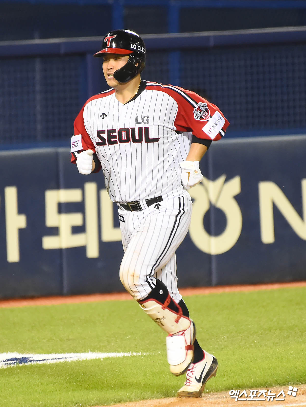 [엑스포츠뉴스 잠실, 윤다희 기자] 30일 오후 서울 송파구 잠실야구장에서 열린 ‘2020 신한은행 SOL KBO 리그’ 두산 베어스와 LG 트윈스의 경기, 8회말 무사 LG 유강남이 솔로 홈런을 날리고 그라운드를 돌고 있다.
