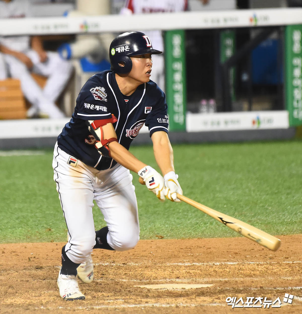 [엑스포츠뉴스 잠실, 윤다희 기자] 30일 오후 서울 송파구 잠실야구장에서 열린 ‘2020 신한은행 SOL KBO 리그’ 두산 베어스와 LG 트윈스의 경기, 8회초 2사 1,2루 두산 정수빈이 1타점 적시타를 날리고 있다.