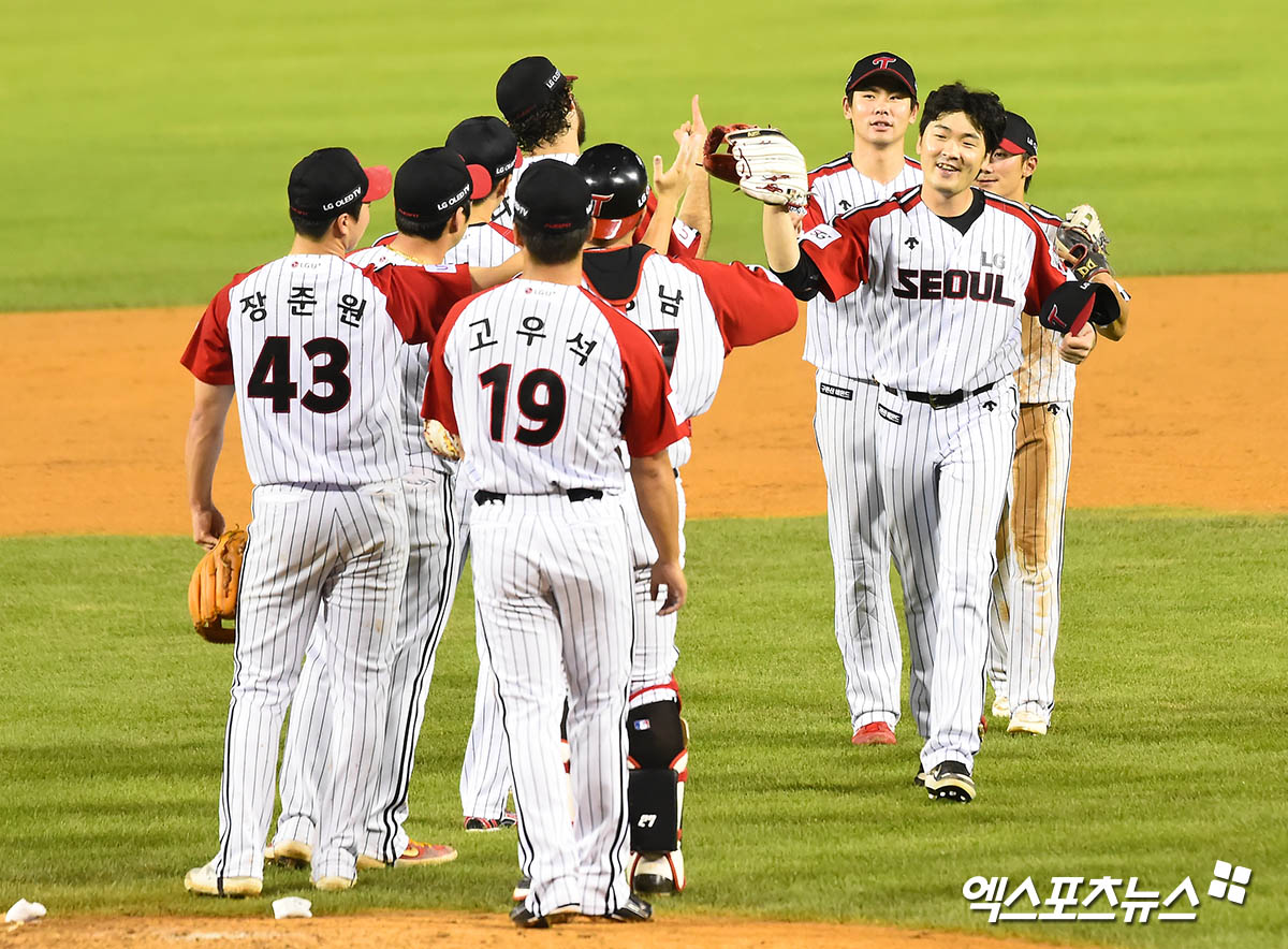 경기 종료 후 LG 선수들이 기쁨을 나누고 있다.
