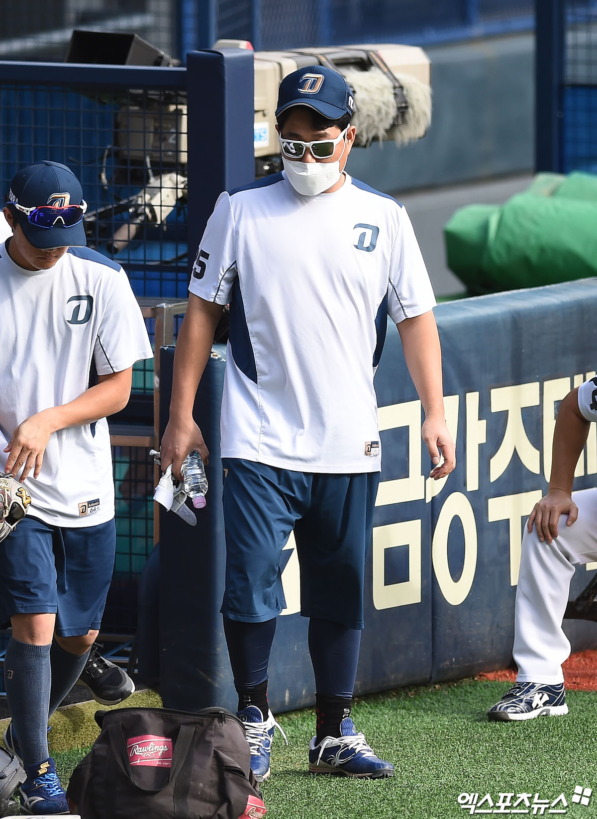 [엑스포츠뉴스 잠실, 박지영 기자] 3일 오후 서울 송파구 잠실야구장에서 열리는 '2020 신한은행 SOL KBO리그' NC 다이노스와 LG 트윈스의 경기에 앞서 NC 양의지가 마스크를 착용한 채 훈련을 위해 그라운드로 나서고 있다.