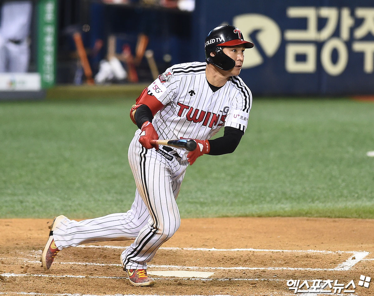 [엑스포츠뉴스 잠실, 박지영 기자] 3일 오후 서울 송파구 잠실야구장에서 열린 '2020 신한은행 SOL KBO리그' NC 다이노스와 LG 트윈스의 경기, 6회초 무사 1루 LG 오지환이 2루타를 때려내고 있다.