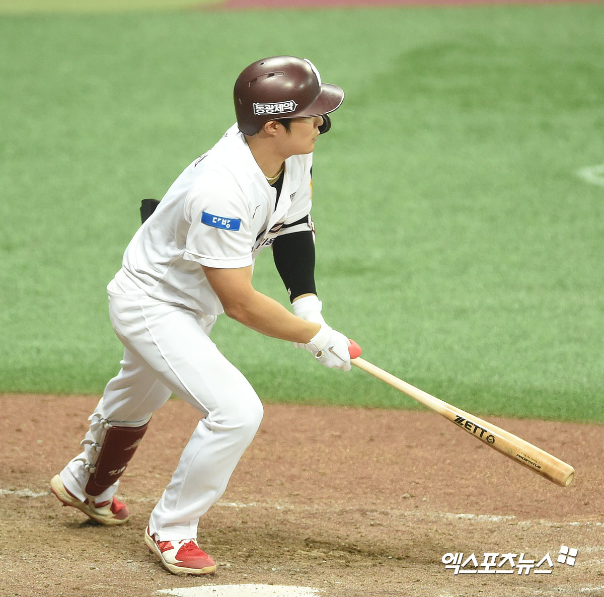 [엑스포츠뉴스 고척, 김한준 기자] 6일 오후 서울 구로구 고척스카이돔에서 열린 ‘2020 신한은행 SOL KBO 리그’ KT 위즈와 키움 히어로즈의 경기, 7회말 1사 2,3루 키움 김하성이 1타점 적시타를 날리고 있다.