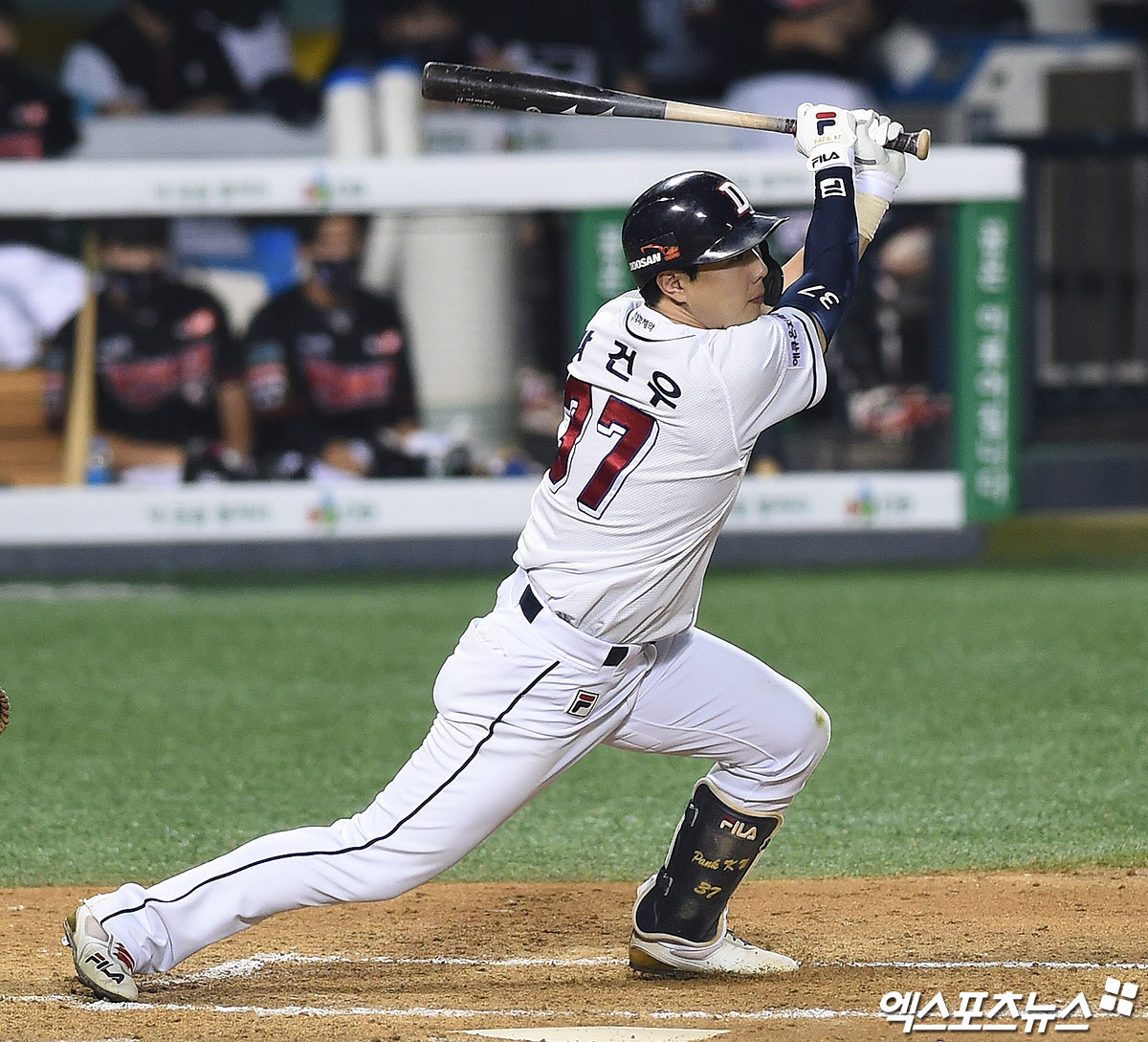 [엑스포츠뉴스 잠실, 박지영 기자] 8일 오후 서울 송파구 잠실야구장에서 열린 '2020 신한은행 SOL KBO리그' KT 위즈와 두산 베어스의 경기, 8회말 무사 1루 두산 박건우가 2루타를 때려내고 있다.