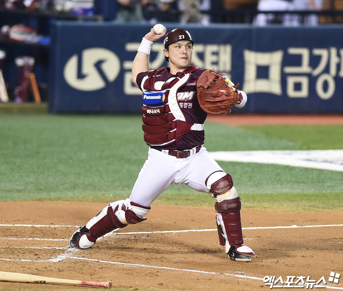 [엑스포츠뉴스 잠실, 박지영 기자] 10일 오후 서울 송파구 잠실야구장에서 열린 '2020 신한은행 SOL KBO리그' 키움 히어로즈와 LG 트윈스의 경기, 2회말 1사 만루 LG 오지환의 1루수 앞 땅볼 때 키움 포수 박동원이 홈에서 3루주자 양석환을 포스아웃시킨 뒤 1루로 송구하고 있다.
