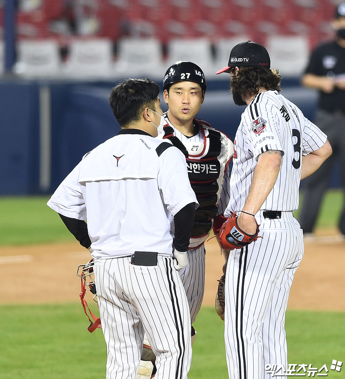 [엑스포츠뉴스 잠실, 박지영 기자] 10일 오후 서울 송파구 잠실야구장에서 열린 '2020 신한은행 SOL KBO리그' 키움 히어로즈와 LG 트윈스의 경기, 3회초 2사 1,2루 LG 포수 유강남이 마운드에 방문해 선발투수 켈리와 이야기를 나누고 있다.