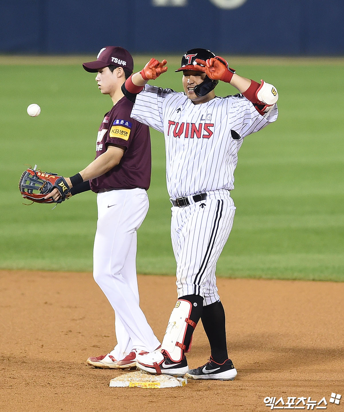[엑스포츠뉴스 잠실, 박지영 기자] 10일 오후 서울 송파구 잠실야구장에서 열린 '2020 신한은행 SOL KBO리그' 키움 히어로즈와 LG 트윈스의 경기, 6회말 2사 1루 LG 유강남이 1타점 적시 2루타를 때려낸 뒤 세리머니를 하고 있다.