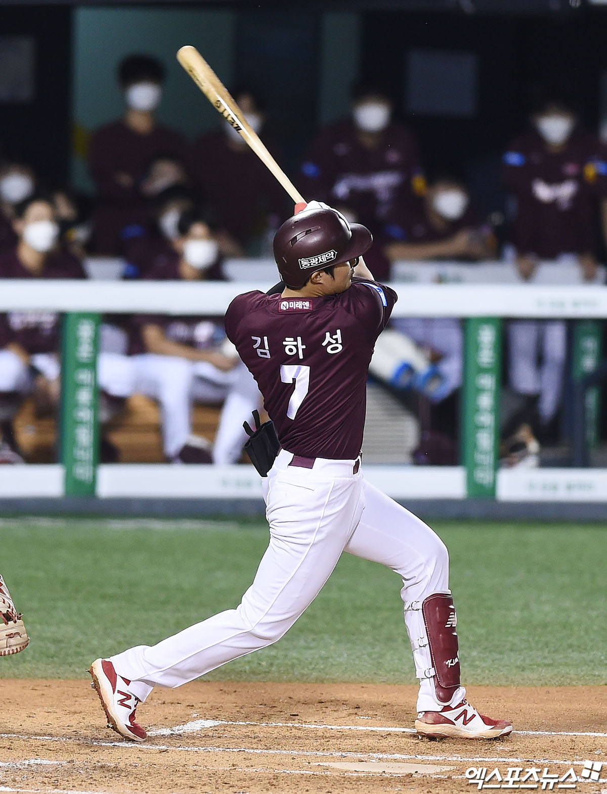 [엑스포츠뉴스 잠실, 박지영 기자] 11일 오후 서울 송파구 잠실야구장에서 열린 '2020 신한은행 SOL KBO리그' 키움 히어로즈와 LG 트윈스의 경기, 2회초 2사 1루 키움 김하성이 2루타를 때려내고 있다.