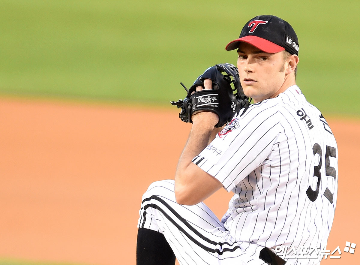 [엑스포츠뉴스 잠실, 김한준 기자] 17일 오후 서울 송파구 잠실야구장에서 열린 ‘2020 신한은행 SOL KBO 리그’ 롯데 자이언츠와 LG 트윈스의 경기, 1회초 LG 선발투수 윌슨이 공을 힘차게 던지고 있다.