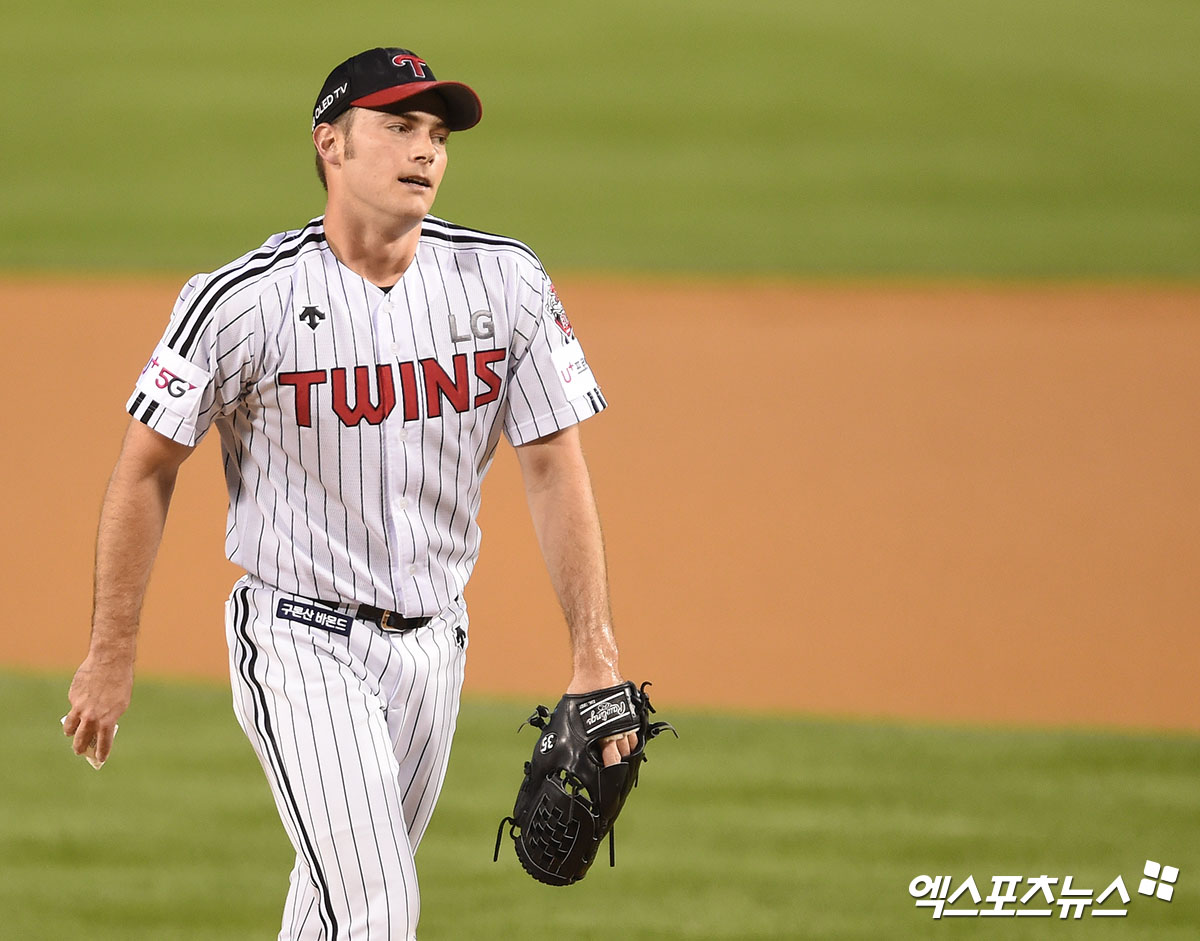 [엑스포츠뉴스 잠실, 김한준 기자] 17일 오후 서울 송파구 잠실야구장에서 열린 ‘2020 신한은행 SOL KBO 리그’ 롯데 자이언츠와 LG 트윈스의 경기, 1회초 수비를 마친 LG 선발투수 윌슨이 더그아웃으로 향하고 있다.