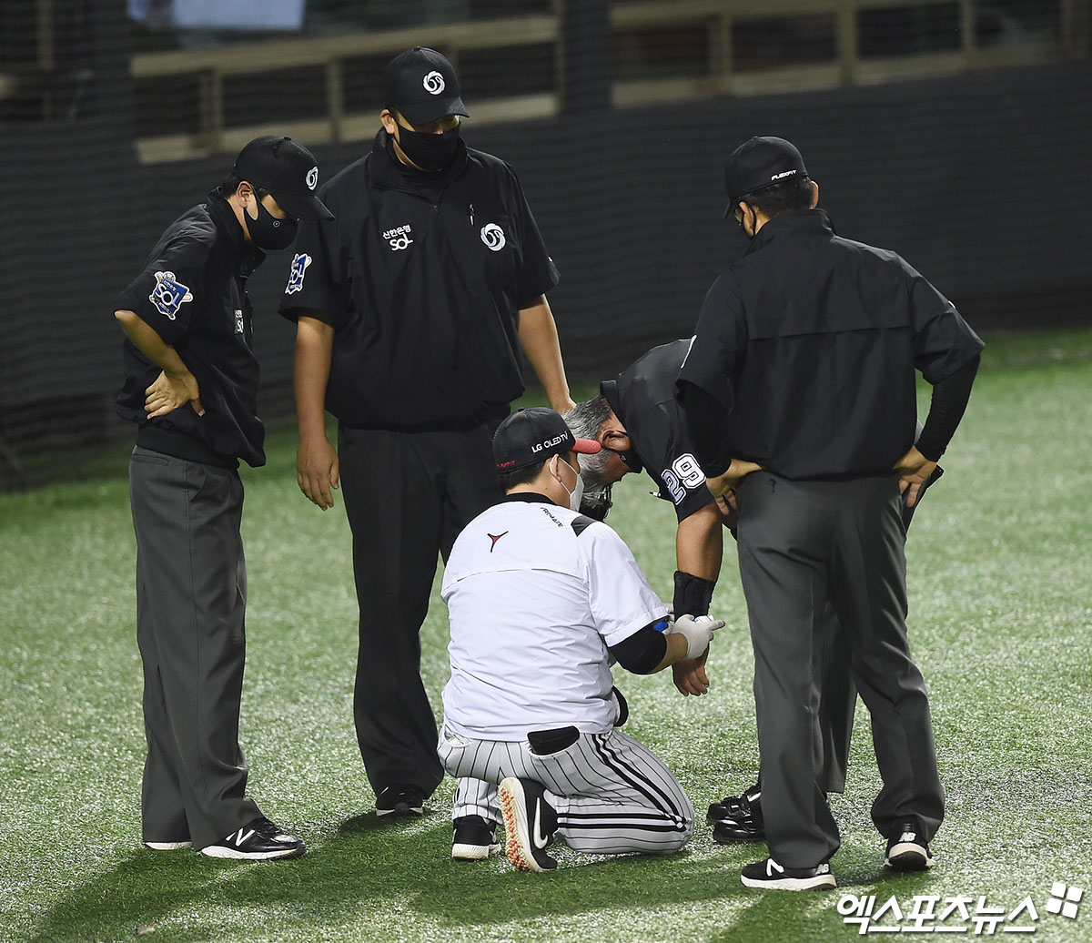 [엑스포츠뉴스 잠실, 박지영 기자] 18일 오후 서울 송파구 잠실야구장에서 열린 '2020 신한은행 SOL KBO리그' 롯데 자이언츠와 LG 트윈스의 경기, 6회말 2사 1루 LG 홍창기의 초구 파울 때 전일수 주심이 타구에 맞은 뒤 고통스러워하고 있다.