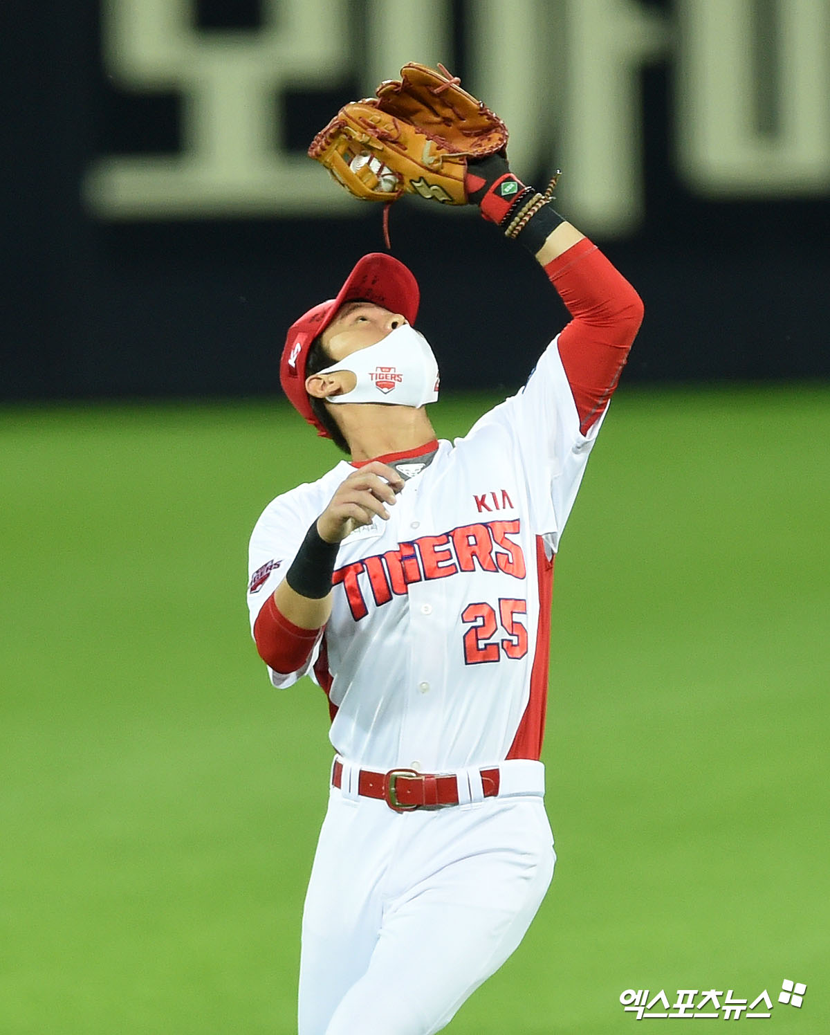 [엑스포츠뉴스 광주, 김한준 기자] 22일 오후 광주-기아 챔피언스필드에서 열린 ‘2020 신한은행 SOL KBO 리그’ 키움 히어로즈와 KIA 타이거즈의 경기, 4회초 무사 1루 KIA 박찬호가 키움 이정후의 타구를 잡아내고 있다.