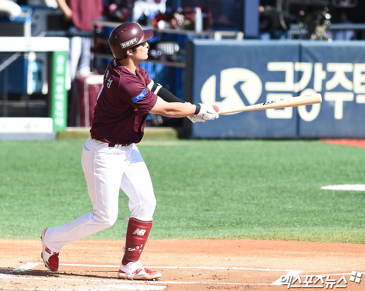 [엑스포츠뉴스 잠실, 박지영 기자] 27일 오후 서울 송파구 잠실야구장에서 열린 '2020 신한은행 SOL KBO리그' 키움 히어로즈와 두산 베어스의 경기, 2회초 무사 2루 키움 김하성이 두산 선발투수 플렉센 상대로 선제 투런 홈런을 때려내고 있다.