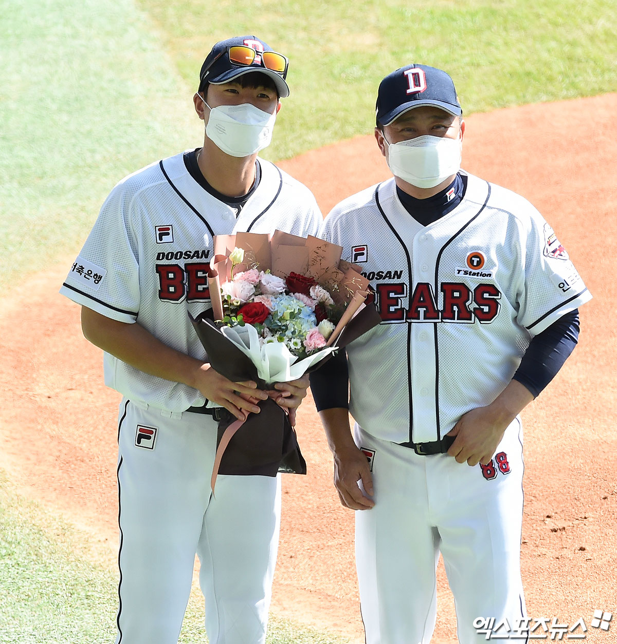 [엑스포츠뉴스 잠실, 박지영 기자] 27일 오후 서울 송파구 잠실야구장에서 열린 '2020 신한은행 SOL KBO리그' 키움 히어로즈와 두산 베어스의 경기에 앞서 두산 김재호의 KBO 역대 100번째 1,000안타 달성 시상식이 진행됐다. 김재호와 김태형 감독이 기념 촬영을 하고 있다.