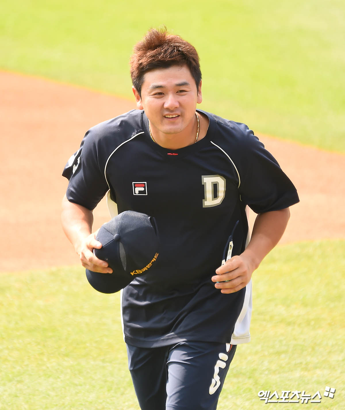​[엑스포츠뉴스 잠실, 윤다희 기자] 2일 오후 서울 송파구 잠실야구장에서 열리는 ‘2020 신한은행 SOL KBO 리그’ KIA 타이거즈와 두산 베어스의 경기에 앞서 두산 최주환이 훈련에 임하고 있다.