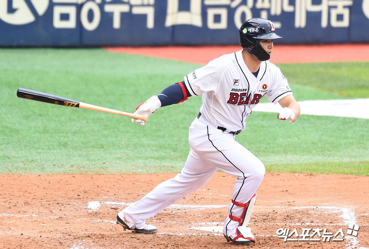 [엑스포츠뉴스 잠실, 윤다희 기자] 2일 오후 서울 송파구 잠실야구장에서 열린 ‘2020 신한은행 SOL KBO 리그’ KIA 타이거즈와 두산 베어스의 경기, 5회말 1사 1루 두산 김재환이 병살타를 날리고 있다.