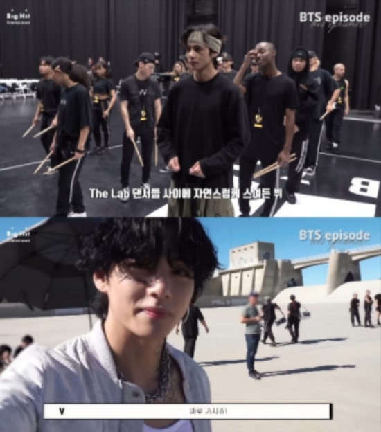 뮤직비디오 촬영 전 연습실에 도착한 뷔는 밝은 표정으로 댄서들을 맞이하고 대형 속에서 댄서인척 연기하는 등 재치를 발휘했다.