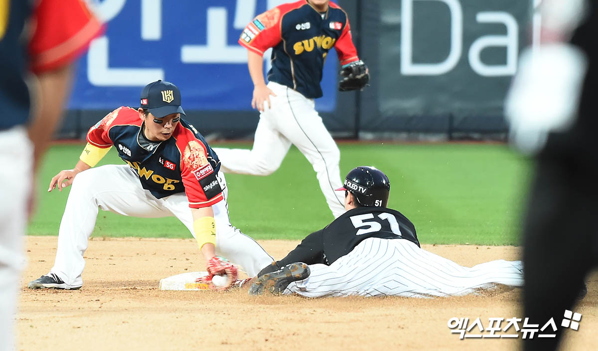 [엑스포츠뉴스 수원, 윤다희 기자] 3일 오후 수원kt위즈파크에서 열린 ‘2020 신한은행 SOL KBO 리그’ LG 트윈스와 kt 위즈의 더블헤더 2차전 경기, 4회초 1사 1루 LG 홍창기가 2루 도루를 실패하고 있다