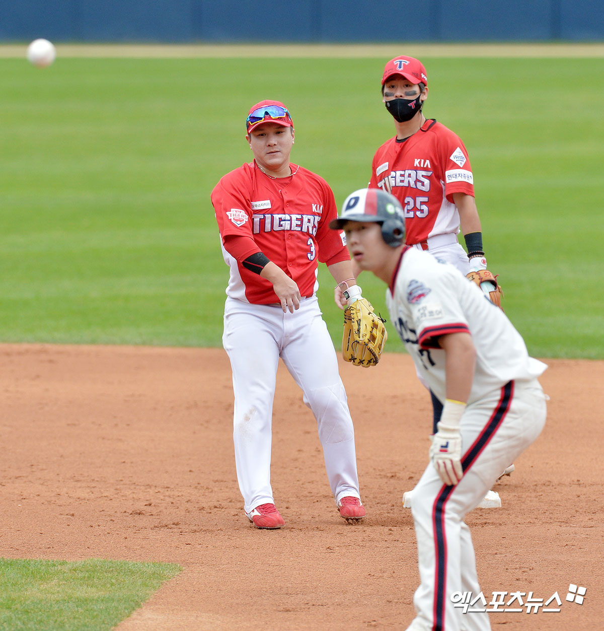 [엑스포츠뉴스 잠실, 김한준 기자] 4일 오후 서울 송파구 잠실야구장에서 열린 ‘2020 신한은행 SOL KBO 리그’ KIA 타이거즈와 두산 베어스의 경기, 6회말 1사 1,3루 KIA 김선빈이 두산 김재호의 내야땅볼때 박건우를 포스 아웃 시킨 후 1루로 송구하고 있다.