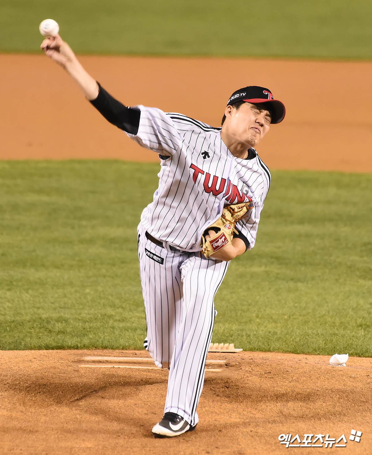 [엑스포츠뉴스 잠실, 윤다희 기자] 7일 오후 서울 송파구 잠실야구장에서 열린 ‘2020 신한은행 SOL KBO 리그’ 삼성 라이온즈와 LG 트윈스의 경기, 1회초 LG 선발투수 임찬규가 역투하고 있다.