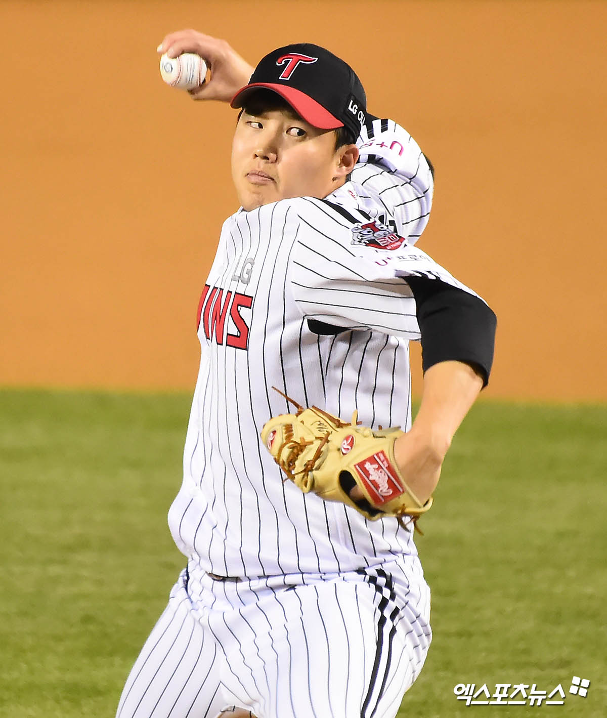 ​[엑스포츠뉴스 잠실, 윤다희 기자] 7일 오후 서울 송파구 잠실야구장에서 열린 ‘2020 신한은행 SOL KBO 리그’ 삼성 라이온즈와 LG 트윈스의 경기, 1회초 LG 선발투수 임찬규가 역투하고 있다.