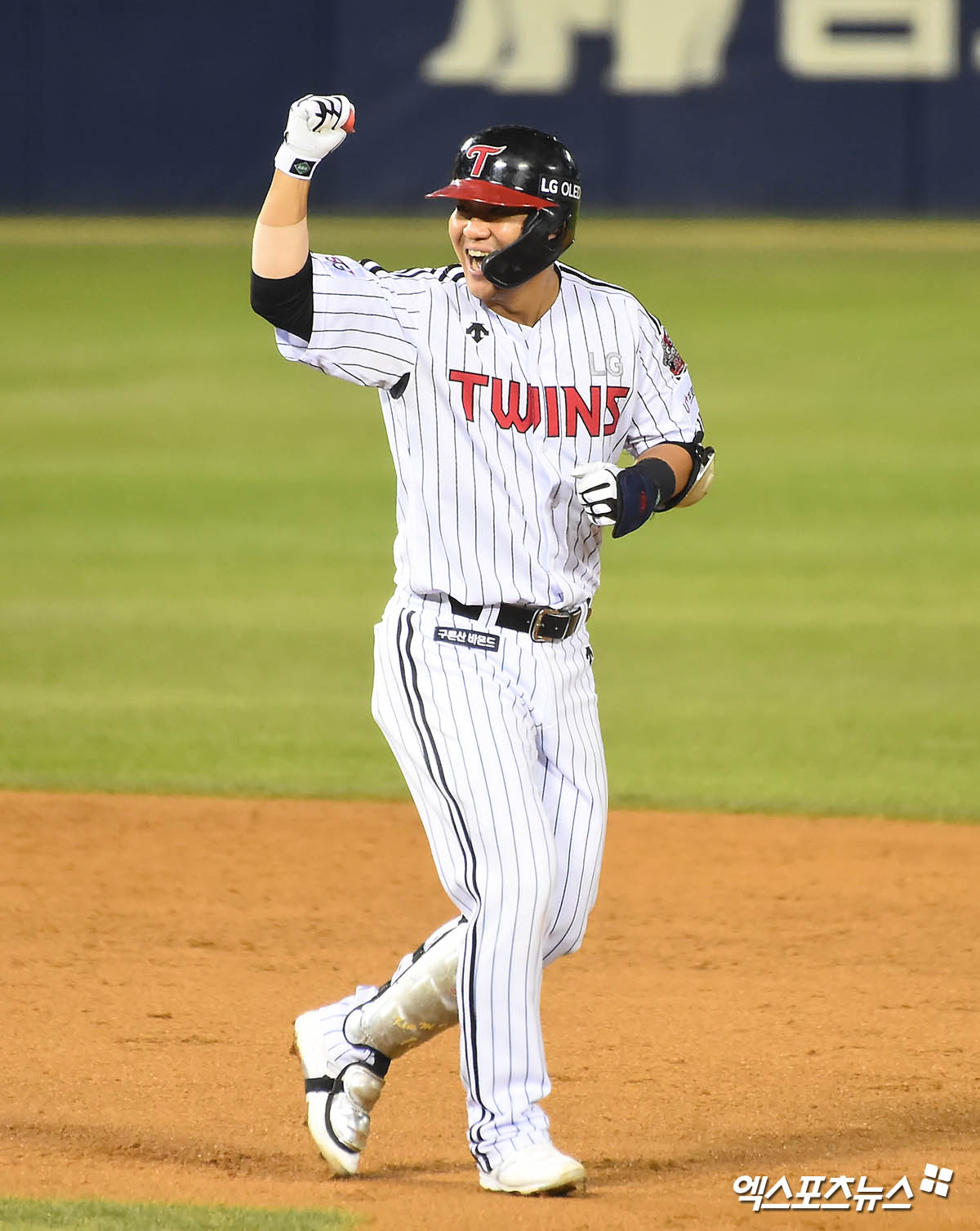 ​[엑스포츠뉴스 잠실, 윤다희 기자] 7일 오후 서울 송파구 잠실야구장에서 열린 ‘2020 신한은행 SOL KBO 리그’ 삼성 라이온즈와 LG 트윈스의 경기, 8회말 무사 1,2루 LG 김민성이 2타점 적시 2루타를 날리고 세리머니를 하고 있다.