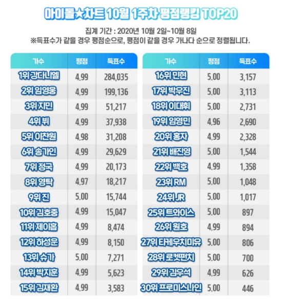 가수 강다니엘이 10월 1주차(20.10.02~20.10.08) 아이돌차트 평점랭킹에서 최다득표를 기록해 눈길을 끈다.