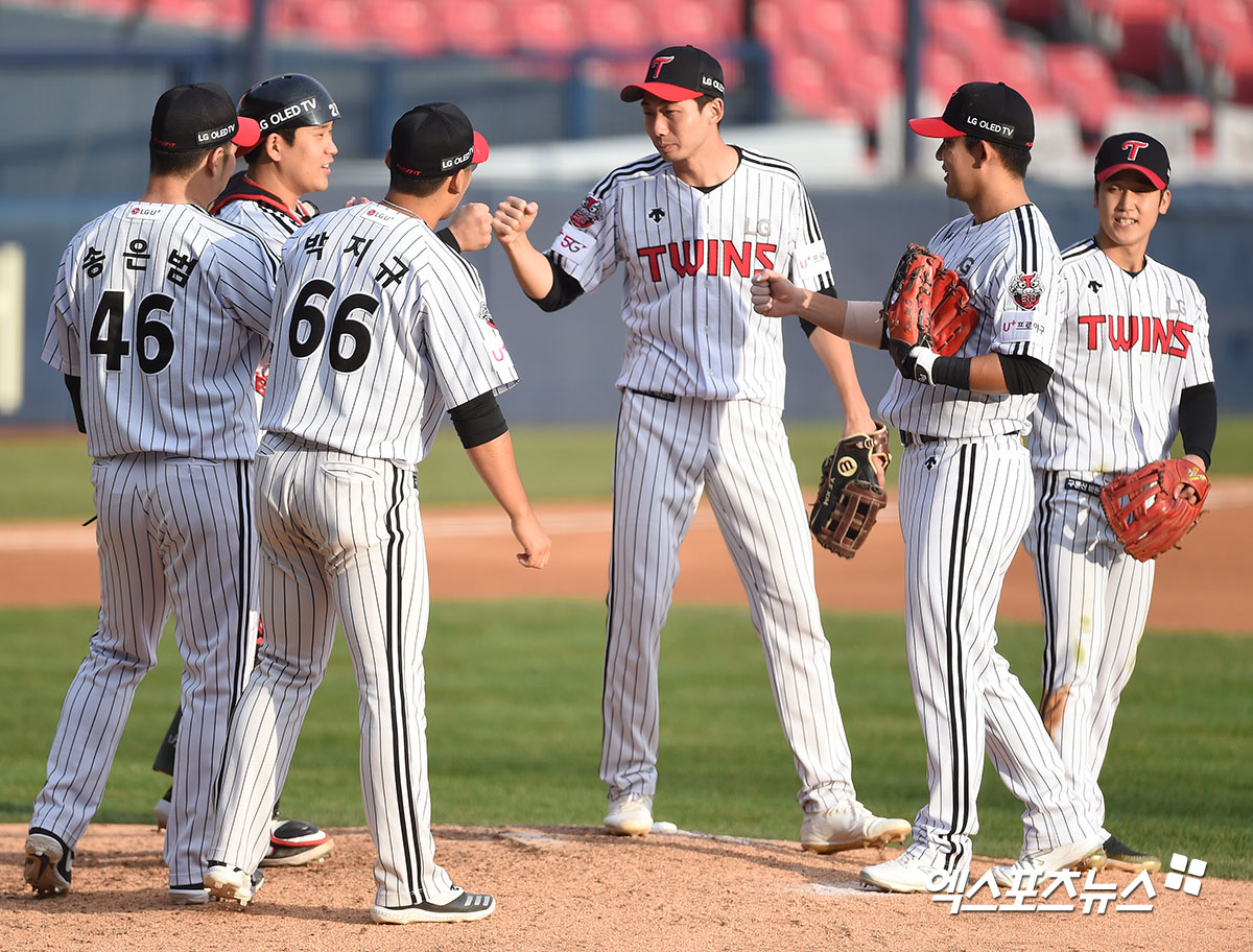 이날 경기에서 승리한 LG 선수들이 기뻐하고 있다.