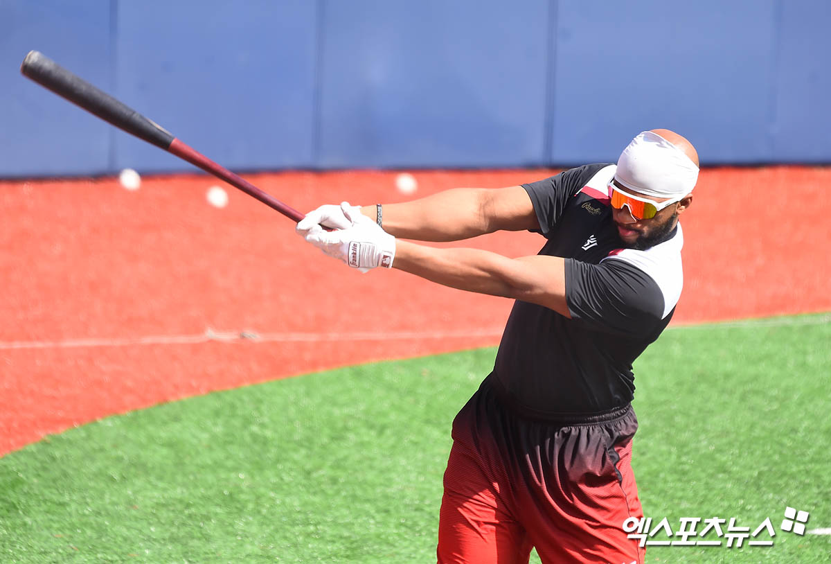 [엑스포츠뉴스 수원, 윤다희 기자] 11일 오후 수원kt위즈파크에서 열리는 ‘2020 신한은행 SOL KBO 리그’ 두산 베어스와 kt 위즈의 경기에 앞서 kt 로하스가 훈련에 임하고 있다.