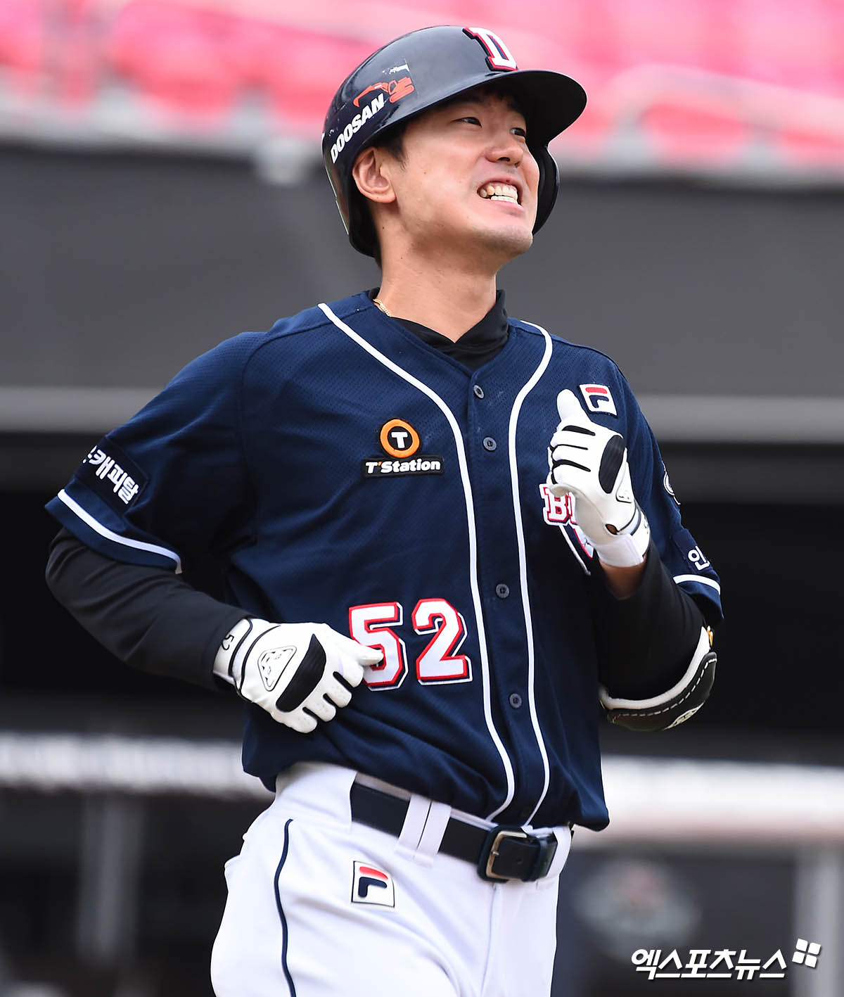 [엑스포츠뉴스 수원, 윤다희 기자] 11일 오후 수원kt위즈파크에서 열린 ‘2020 신한은행 SOL KBO 리그’ 두산 베어스와 kt 위즈의 경기, 4회초 2사 만루 두산 김재호가 투수 땅볼을 날리고 아쉬워하고 있다.
