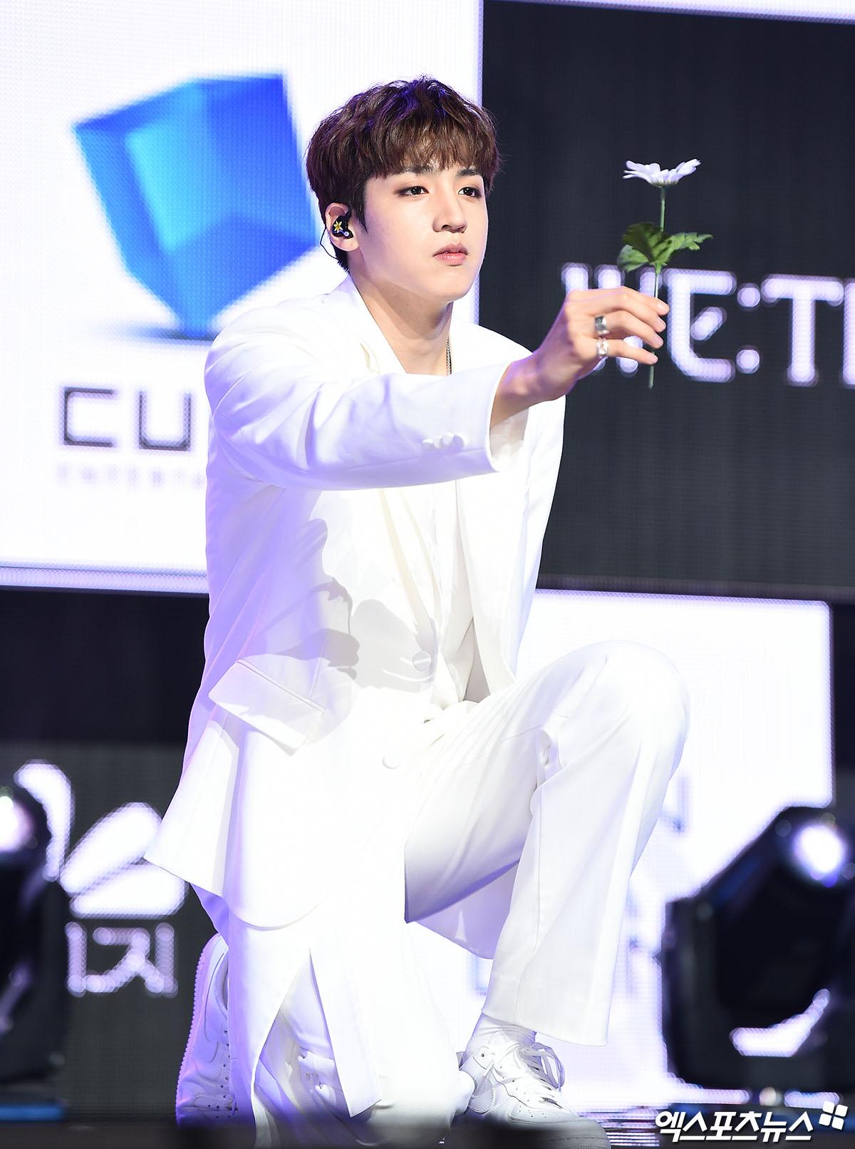 [엑스포츠뉴스 박지영 기자] 12일 오후 서울 한남동 블루스퀘어에서 그룹 펜타곤 미니 10집 앨범 'WE:TH(위드)' 발매 기념 쇼케이스가 열렸다. 이날 쇼케이스에 참석한 펜타곤 우석이 포토타임을 갖고 있다.