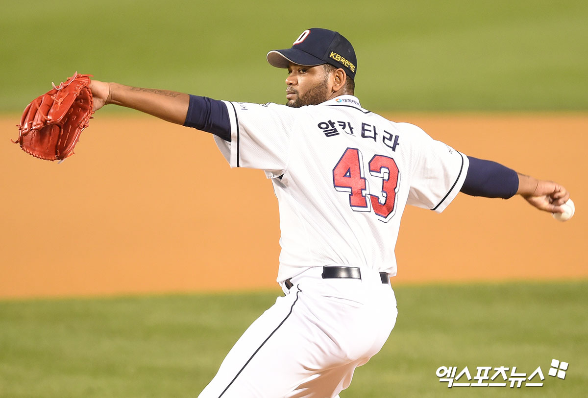 [엑스포츠뉴스 잠실, 김한준 기자] 13일 오후 서울 송파구 잠실야구장에서 열린 ‘2020 신한은행 SOL KBO 리그’ 한화 이글스와 두산 베어스의 경기, 1회초 두산 선발투수 알칸타라가 공을 힘차게 던지고 있다.